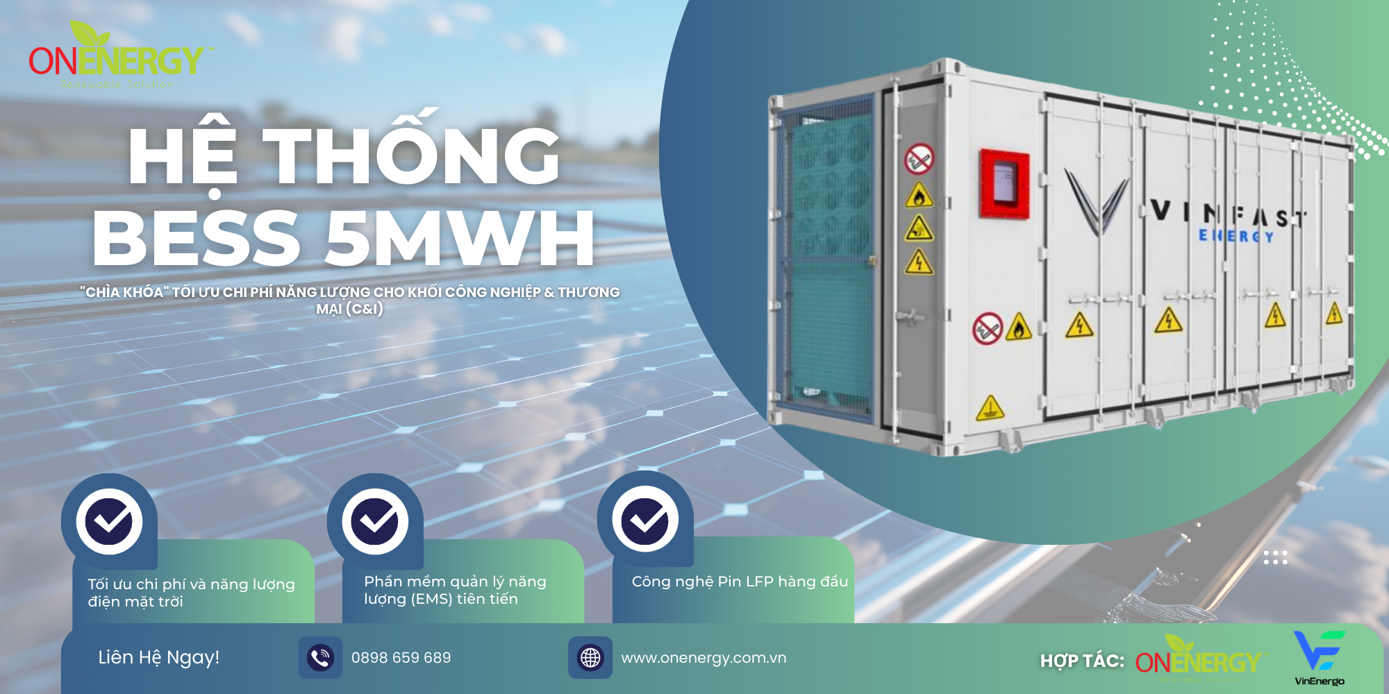 Tiên phong trong việc nghiên cứu, phát triển hệ thống Pin lưu trữ dung lượng cao cho hệ thống điện mặt trời mái nhà(BESS), ON Energy tự hào sẽ là một những công ty hàng đầu trong việc đưa hệ thống Pin lưu trữ phổ biến đến tất cả các công trình tại Việt nam.